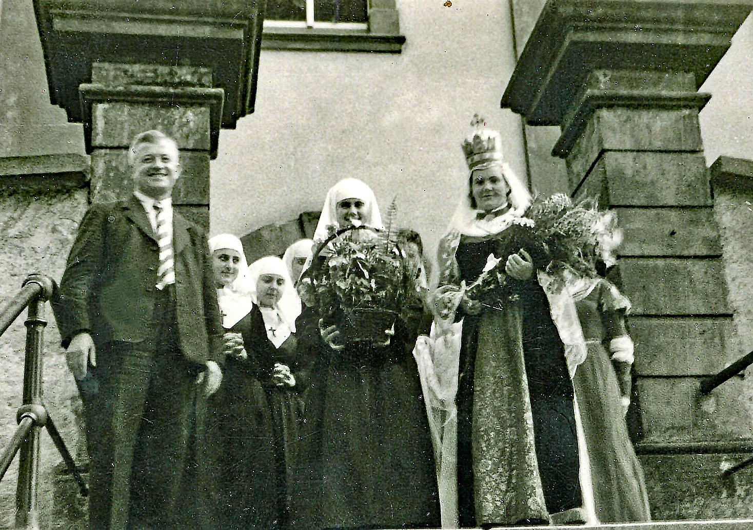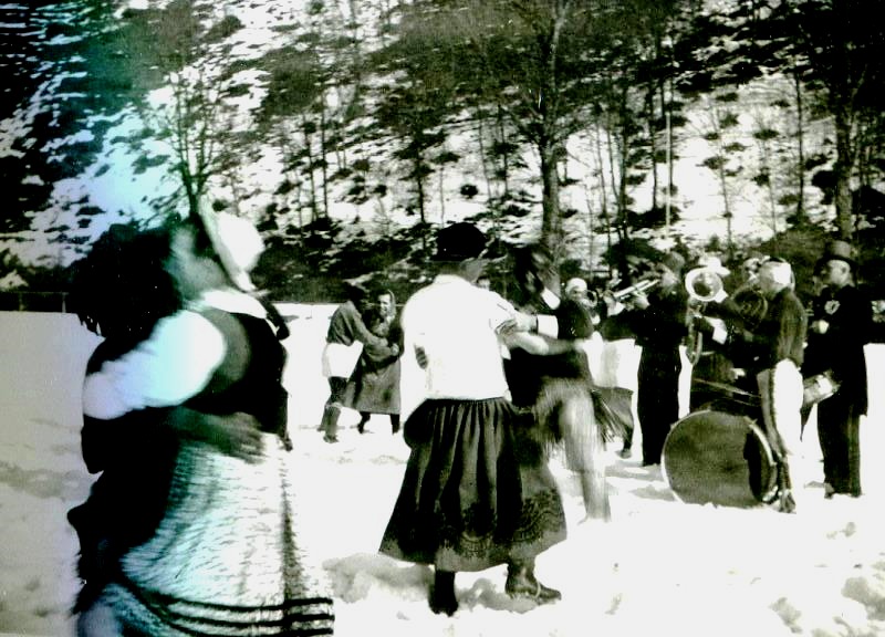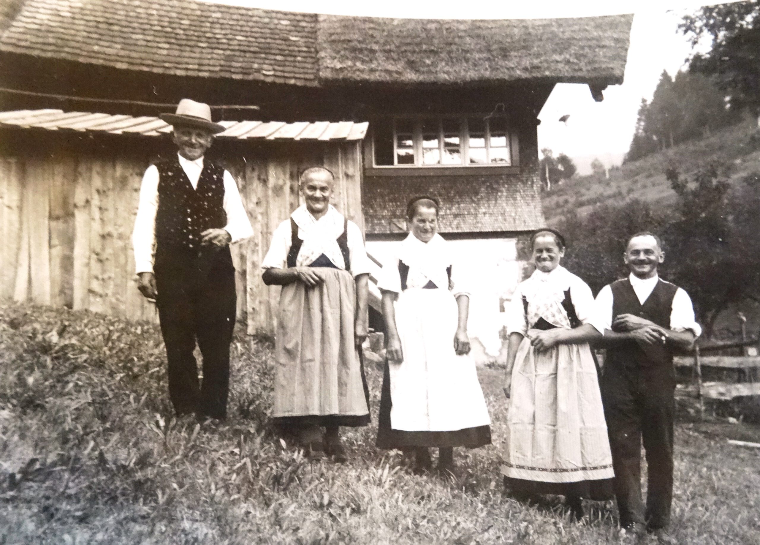 Die Eltern sind Nikolaus und Pauline (geborene?) Feger – vom Zacherhof. Von links Otto Schnetzer mit Ehefrau Maria Anna, geborene Feger, Zacherbauer Matthäus Feger, spätere Lindenwirtin Antonia Feger (also verheiratete Heitzmann), Monika Feger, geb. Hacker (vom Schulerjörgenhof) mit Ehemann Lorenz Feger Eltern von Anton Feger (der ja auch „Zacherlorenz“ genannt wurde!) – Mädchen mit Mütze Kind Rosalia Feger, verh. Baur, Mädchen mit Tracht und die beiden Buben von Schnetzers (an der Walke, neben dem „Hirschen“)