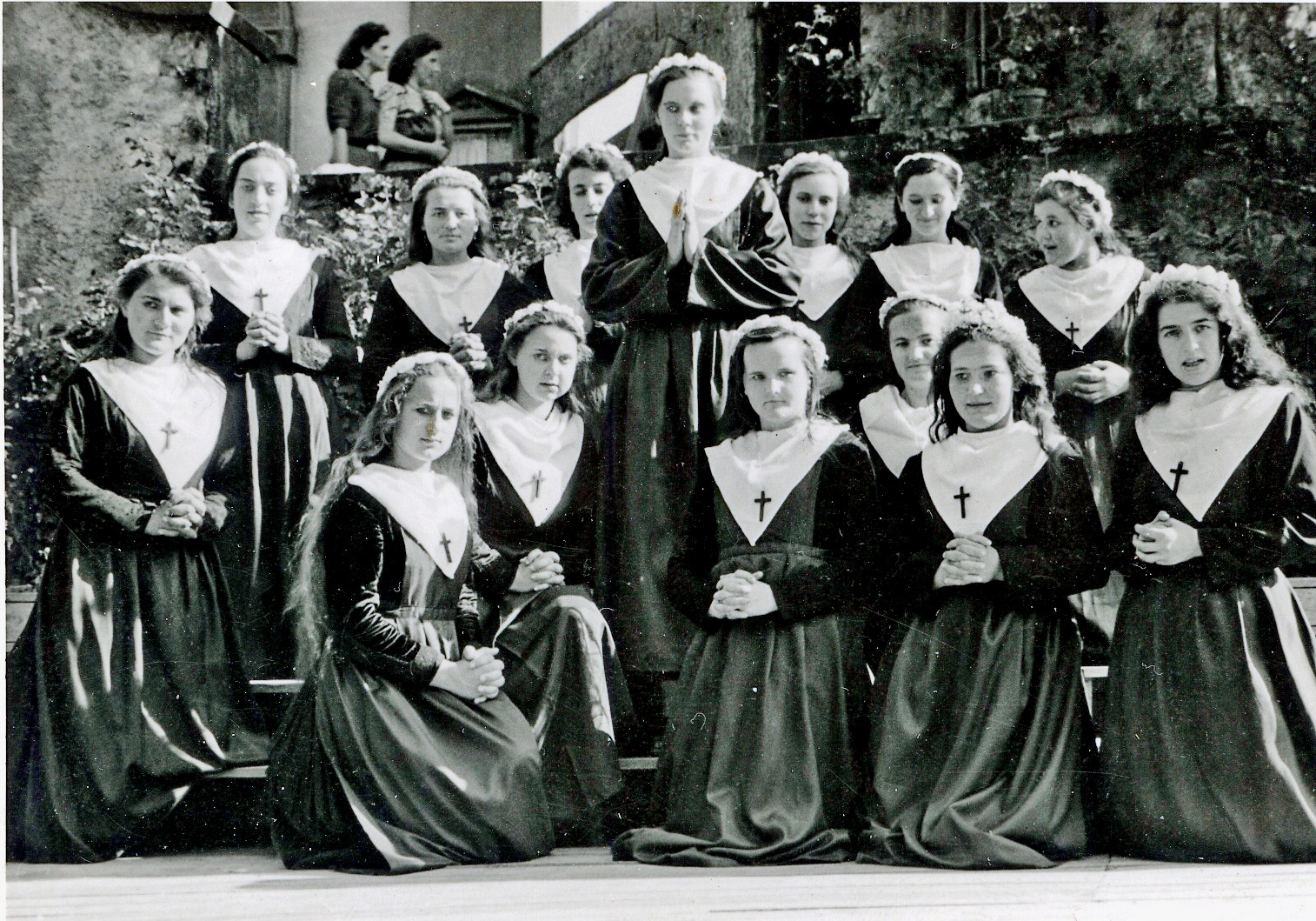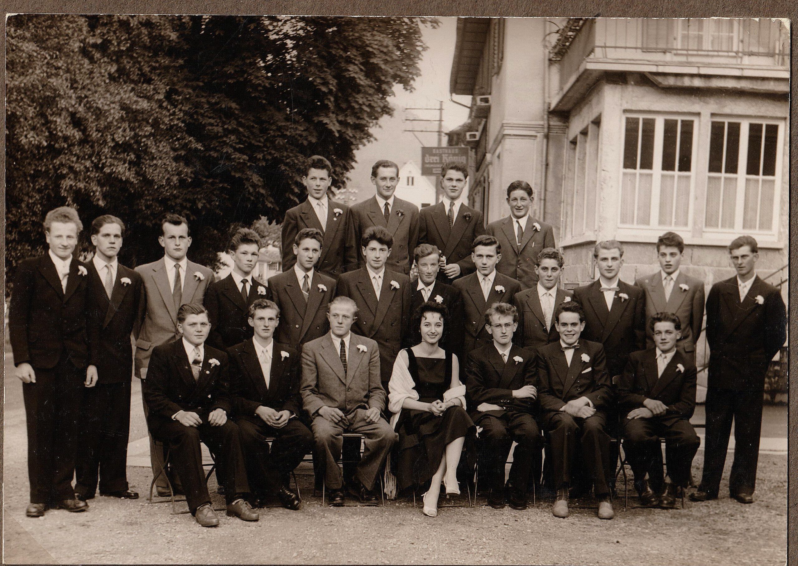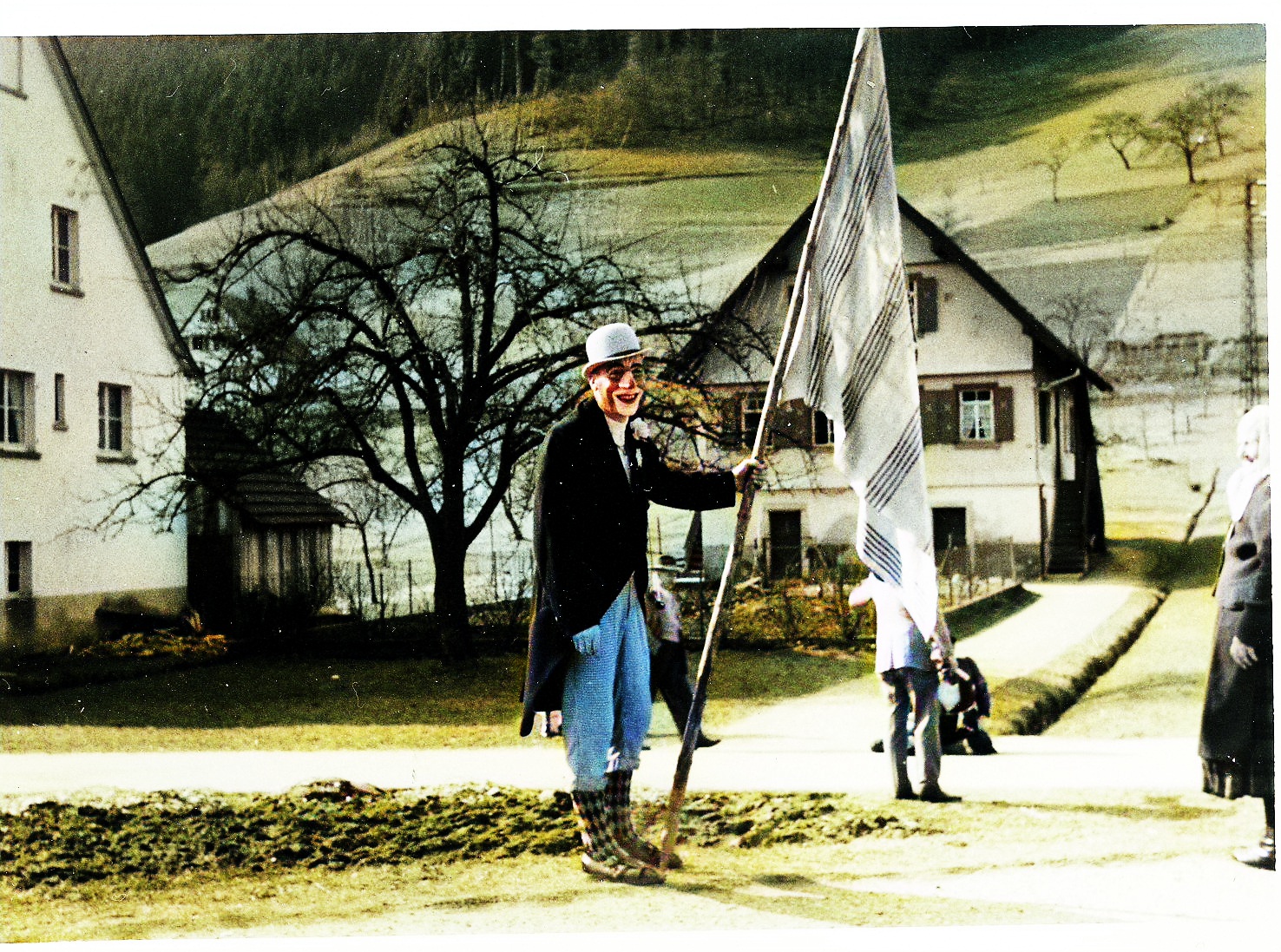 Die Eltern sind Nikolaus und Pauline (geborene?) Feger – vom Zacherhof. Von links Otto Schnetzer mit Ehefrau Maria Anna, geborene Feger, Zacherbauer Matthäus Feger, spätere Lindenwirtin Antonia Feger (also verheiratete Heitzmann), Monika Feger, geb. Hacker (vom Schulerjörgenhof) mit Ehemann Lorenz Feger Eltern von Anton Feger (der ja auch „Zacherlorenz“ genannt wurde!) – Mädchen mit Mütze Kind Rosalia Feger, verh. Baur, Mädchen mit Tracht und die beiden Buben von Schnetzers (an der Walke, neben dem „Hirschen“)